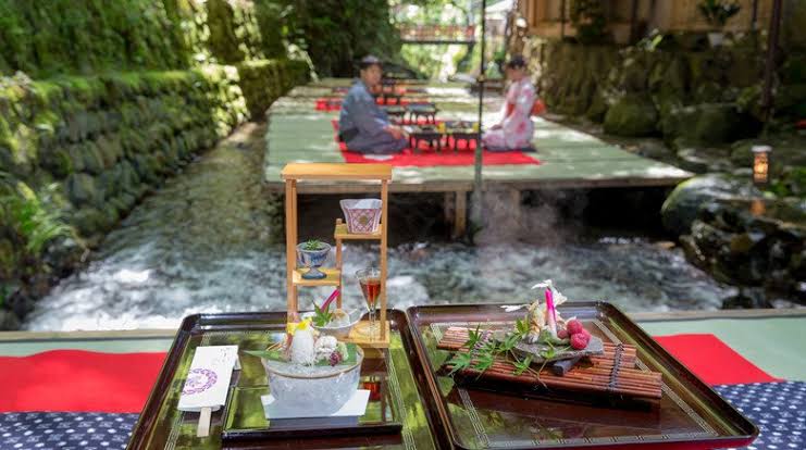 Saat musim panas kamu bisa menikmati sensasi makan hidangan tradisional Jepang di atas restoran apung bernama kawa-doko atau kawa-yuka. Di atas sungai dengan aliran air yang jernih dibangun sebuah platform tanpa atap dan di platform ini pengunjung bisa bersantai menikmati hidangan sambil ditemani angina sepoi-sepoi dari pegunungan.